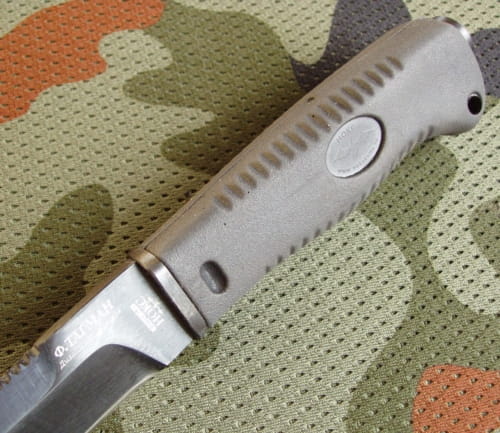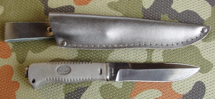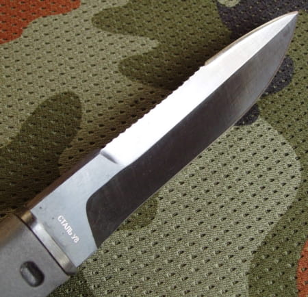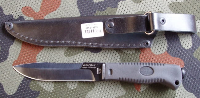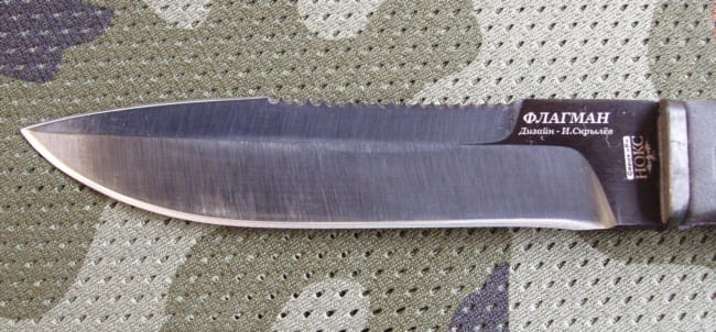 Rozumnych rozmiarów tactic o wojskowym rodowodzie ze stali U8. Zbliżony do noża Okopowy - podobna głownia o wysokim szlifie ze sztychem typu spear point, idealnym do zadawania pchnięć. Obuch Flagmana jest zeszlifiwany do falszostrza na prawie całej długości i posiada 4,5-centymetrowy odcinek z piłką. Gumowa rękojeść zdejmuje się po odkręceniu nakrętki (widoczna na fotografii), co pozwala dorabiać (we własnym zakresie) i zakładać różne typy gard, których z zasady pozbawione są w Rosji cywilne wersje noży bojowych.