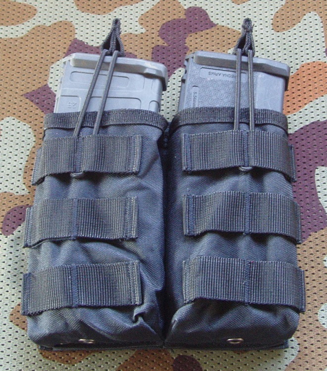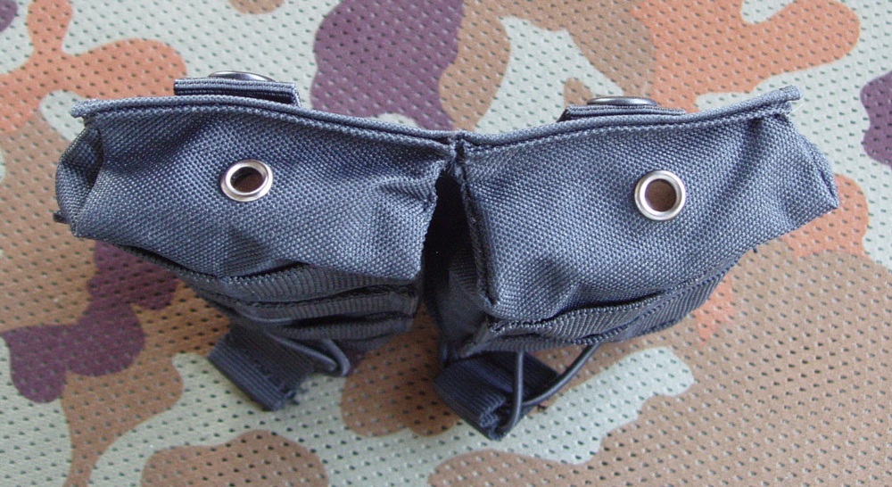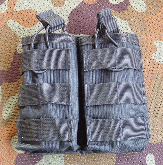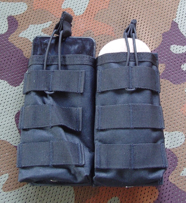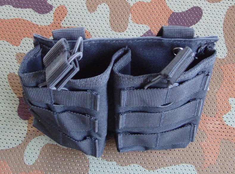 Ładownica otwarta z wytrzymałej kordury na dwa magazynki AR15/M16/M4 z zawieszeniem w systemie MOLLE. Regulowane elastyczne linki zabezpieczają magazynek przed wypadnięciem. Otwory do ściekania wody w dnie. Nie tylko dla miłośników militariów czy air softu – to praktyczny i coolerski podwójny futerał/kaburka na przedmioty codziennego użytku do zawieszenia na pasku. Ostatnie zdjęcie przedstawia ładownice z telefonem komórkowym i etui do okularów.