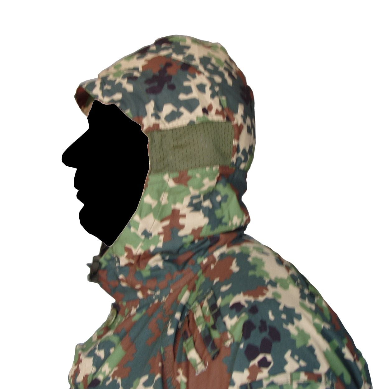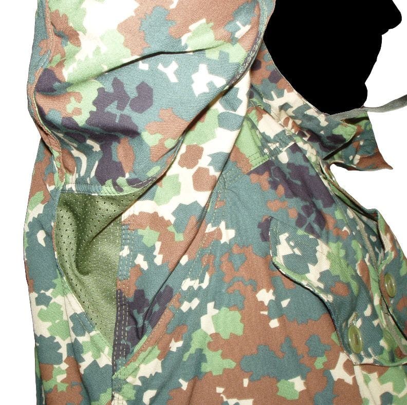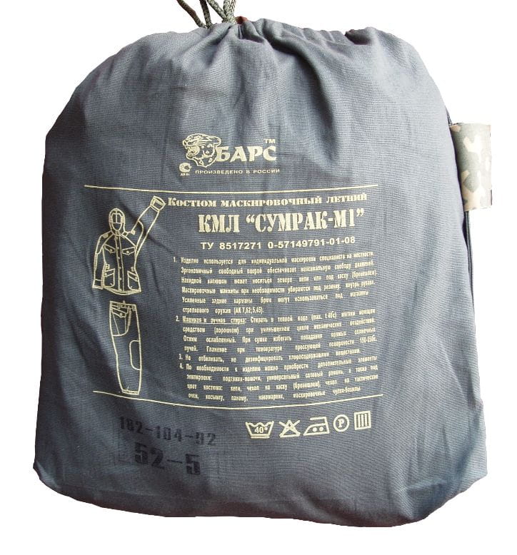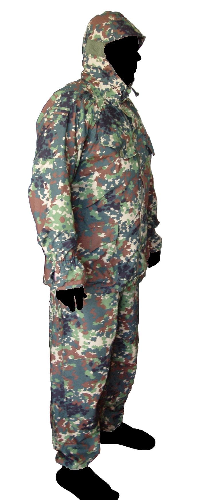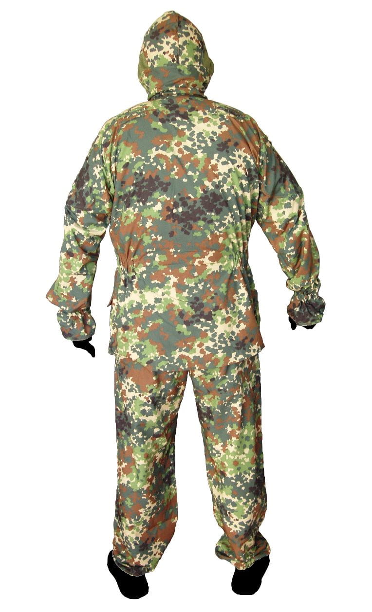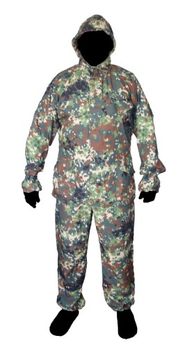 Kombinezon maskujący składający się z bluzy z kapturem i spodni w kamuflażu "izłom". Góra rozpinana pośrodku, z zapięciem na guziki. Cztery nakładane kieszenie z przodu kurtki zapinane na guziki. Materiałowe wzmocnienia na łokciach. Na ramionach i w okolicy łopatek naszyte wąskie kawałki materiału do mocowania elementów maskujących. Pod pachami wstawki zapewniające lepszą wentylację. Takie same wstawki w kapturze na uszach dla lepszej słyszalności. Gumowe ściągacze przy mankietach i w talii.