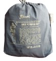 Spodnie z czterema kieszeniami, dwiema ukośne u pasa i dwiema nakładane z tyłu z klapami i zapięciem na guziki. U pasa dwie pętelki pod boczne szelki (szelek nie ma w komplecie). Na końcach nogawek i u pasa elastyczne gumowe ściągacze.Wzmocnienia materiałowe na kolanach. Kombinezon zapakowany jest w płócienny worek z nadrukiem.