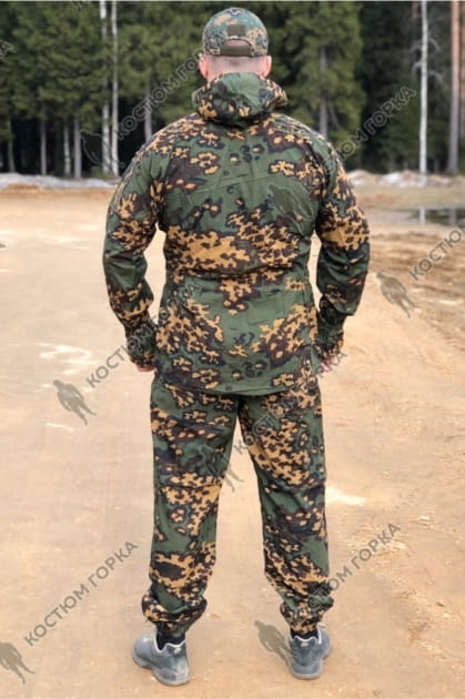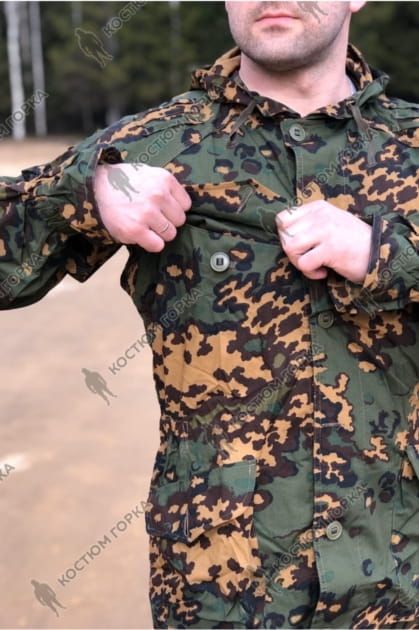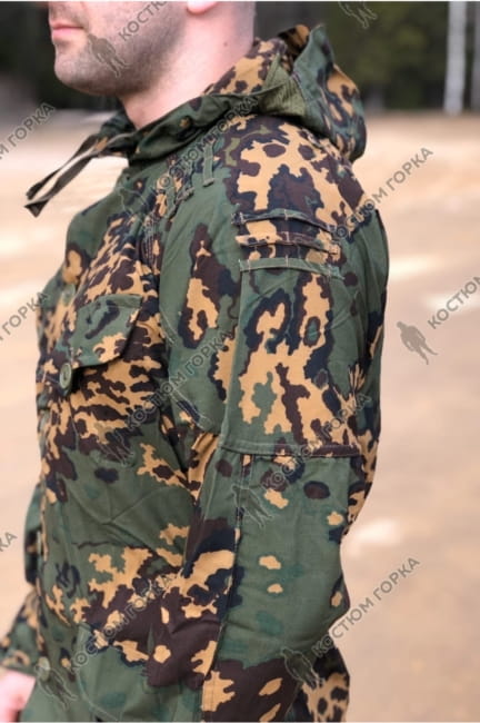 Kombinezon maskujący składający się z bluzy z kapturem i spodni w kamuflażu "liaguszka". Góra rozpinana pośrodku, z zapięciem na guziki. Cztery nakładane kieszenie z przodu kurtki zapinane na guziki. Materiałowe wzmocnienia na łokciach. Na ramionach i w okolicy łopatek naszyte wąskie kawałki materiału do mocowania elementów maskujących. Pod pachami wstawki zapewniające lepszą wentylację. Takie same wstawki w kapturze na uszach dla lepszej słyszalności. Gumowe ściągacze przy mankietach i w talii.
