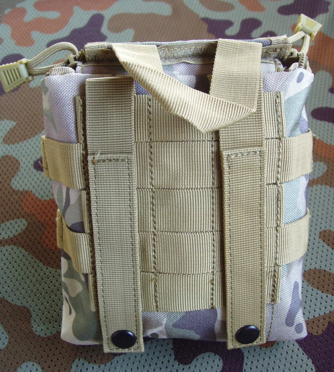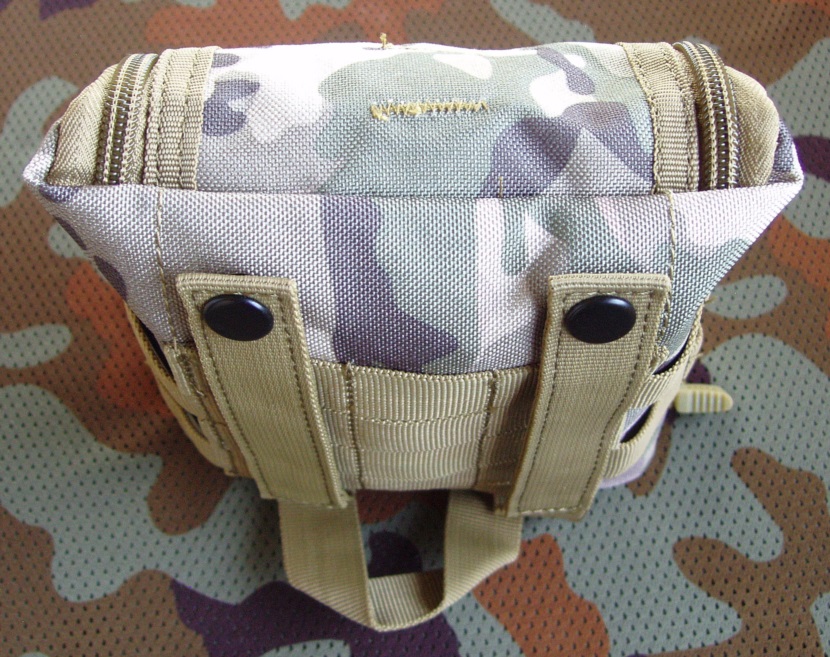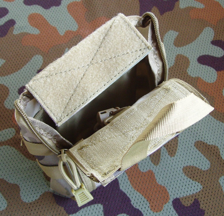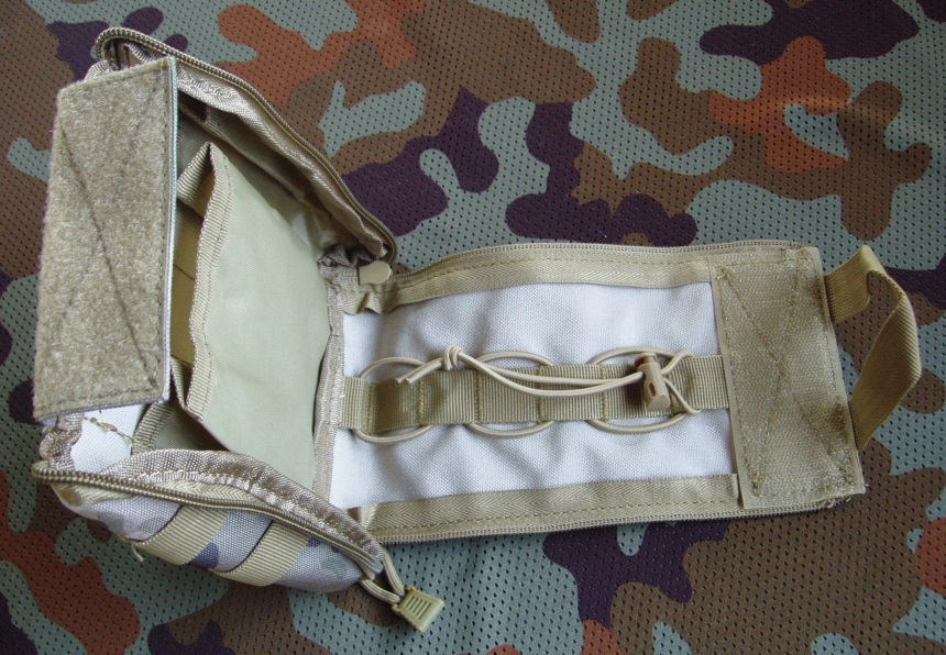 Apteczka z kordury z zawieszeniem w systemie MOLLE. Apteczka zamykana jest klapą, która od góry trzyma się na szerokom rzepie a po bokach ma dwa zamki błyskawiczne biegnące do samego dołu. Kiedy apteczka jest w położeniu wertykalnym to po otworzeniu zamków klapa opada ku dołowi. Dlatego przedmioty na klapie mocowane są do niej za pomocą elastycznej linki z ogranicznikiem żeby nie wypadły. Pozostałe przedmioty rozmieszczone są w trzech kieszeniach na tylnej, przylegającej do systemu nośnego ściance apteczki. Widoczny na zdjęciach czerwony krzyż jest na rzepie, można go zdjąć. Apteczka sprzedawana jest bez wkładu (bandaży, plastrów itp.), tylko jako pojemnik.